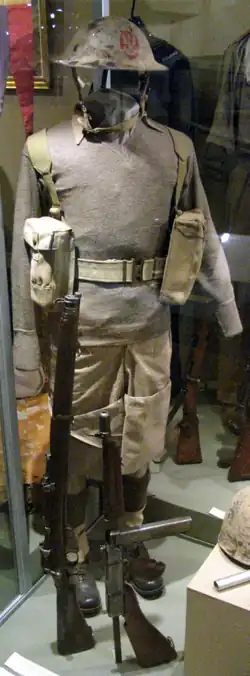 The intended number of men at arms was 348 officers and 5326 soldiers and NCOs.[2] However, the brigade did not reach it prior to being sent into battle. Each infantry battalion was composed of 4 rifle companies, each in turn composed of 3 rifle platoons and staff company (signals, AA, mortars, engineers and recce). The artillery initially composed of a mixture of French equipment and British Ordnance QF 18 pounder guns. By June 1941 all pieces of artillery were replaced with Ordnance QF 25 pounder. Despite the uniformity in equipping the artillery sub-units, they received the traditional Polish names of "Light Artillery", "Heavy Artillery" and "Mounted Artillery".[2] Around that time also the anti-tank battalion was created, with 4 batteries, each consisting of 4 pieces of artillery.[2]