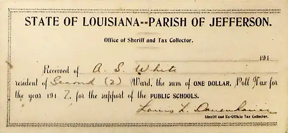 Prior to the mid 20th century, a poll tax was implemented in some U.S. state and local jurisdictions and paying it was a requirement before one could exercise one's right to vote. After this right was extended to all races by the Fifteenth Amendment to the Constitution, many Southern states enacted poll taxes as a means of excluding African-American voters, most of whom were poor and unable to pay a tax. So as not to disenfranchise many whites, such laws sometimes included a clause exempting any people who had voted prior to enactment of the laws.[43] The poll tax, along with literacy tests and extra-legal intimidation,[44] such as by the Ku Klux Klan, achieved the desired effect of disenfranchising African Americans.