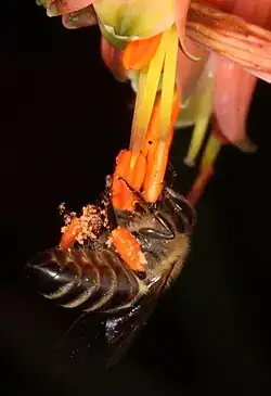 Few pollen-collecting animals are obligate pollen thieves. Rather pollen theft generally arises from a mismatch between the morphology or behaviour of a pollen collecting animal and the morphology or phenology of a flowering plant species.[3] The clearest examples of pollen theft are when pollen-collecting insects visit only the male (pollen-bearing) plants of dioecious species, and so never come into contact with female flowers.[4] However pollen theft can also arise if pollen-collectors visit only male-phase (pollen-bearing) flowers of dichogamous species, or are too small to contact stigmas while collecting pollen from species with large or highly herkogamous flowers.[5] Pollen thieves include beetles,[6] flies,[7] thrips,[8] and even a parakeet,[9] but the vast majority documented so far have been bees.[10] These include Trigona species, which often bite through anthers to access pollen,[11] Halictids,[12] bumble bees,[13] and, most commonly of all, honey bees.[10] Honey bees are thought to be particularly common pollen thieves as they are behaviourally flexible, often visiting flowers in 'unexpected' ways that avoid floral mechanisms for ensuring pollen deposition,[14] or because they have been introduced by humans for agriculture and so more frequently encounter plants that have not evolved in their presence.[15][4]