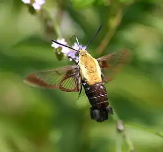 Other moths (Noctuids, Geometrids, Pyralids, for example) fly slowly and settle on the flower. They do not require as much nectar as the fast-flying hawk moths, and the flowers tend to be small (though they may be aggregated in heads).[6]