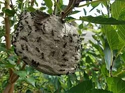 Polybia paulista are swarm-founding wasps which are highly social societies that are complex.[6] The diverse organization of social structure creates different partitioning locations, collecting and transporting or storing resources.[6] In colonies there is a division of labour which is based on age and caste differentiation; young castes have low risk in nest duties, mirage caste are involved in external nest activities such as construction and defensive against predators or parasites and older castes do high-risk duties, such as foraging.[6] Designated workers in the colony have the tasks of nest building, foraging, brood feeding and defence of the colony.[6]
