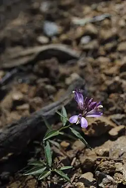 Rhinotropis californica, synonym Polygala californica,[1] is a species of flowering plant in the milkwort family known by the common name California milkwort.[2] It is native to southwestern Oregon and northern and central California, where it grows in the coastal mountain ranges in local habitat types such as chaparral and forest. It is a perennial herb producing spreading stems, generally decumbent in form, up to about 35 centimeters in maximum length, lined with narrow oval leaves each a few centimeter long. The upper inflorescences produce several open flowers, and there may be some closed, cleistogamous flowers lower on the plant. The open flowers have pink or white winglike lateral sepals with hairy edges. The petals are similar in color, the central one tipped with a white or yellow beak. The fruit is a flattened green capsule up to a centimeter long containing hairy seeds.