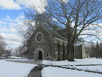 Pomfret School was founded in 1894 on the estate of Charles Grosvenor. It now includes brick Georgian and Colonial Revival buildings built during the first decade of the 20th century, designed by New York architect Ernest Flagg, including the Romanesque 1908 Clark Chapel.