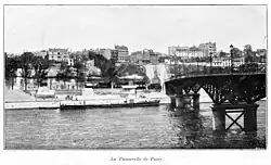 The bridge was built in replacement of the Passerelle de Passy (Footbridge of Passy) which dated from the Exposition Universelle of 1878. A contest for the metallic structure of the new bridge was organized between 8 November 1902 and 14 January 1903.[2] The Passerelle was moved downstream by 30 meters before the construction of the bridge started, in order to provide a crossing of the river during construction of the new bridge.[3] The moving of the Passerelle took place on 20 and 21 August 1903; on 22, the Passerelle was tested for safety, and on 23 it was reopened to circulation.[4] The Passerelle would only be demolished after completion of the bridge in 1905. Construction of the new bridge was made under the direction of Louis Biette, by Daydé & Pillé.