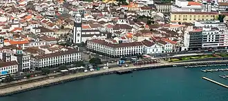 Ponta Delgada (European Portuguese pronunciation: [ˈpõtɐ ðɛlˈɣaðɐ] ⓘ; lit. 'Thin Cape') is the largest municipality (concelho) and executive capital of the Autonomous Region of the Azores in Portugal. It is located on São Miguel Island, the largest and most populous in the archipelago. As of 2021, it has 67,287 inhabitants,[2] in an area of 232.99 square kilometres (89.96 square miles).[3] There are 17,629 residents in the three central civil parishes that comprise the historical city: São Pedro, São Sebastião, and São José.[4] Ponta Delgada became the region's administrative capital under the revised constitution of 1976; the judiciary and Catholic See remained in the historical capital of Angra do Heroísmo while the Legislative Assembly of the Azores was established in Horta.