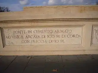 The works for the building began in 1909 and were completed two years later. The bridge was designed and built by Giovanni Antonio Porcheddu,[3] with the cooperation of the engineers Giaj and Parvopassu, on the occasion of the exhibition for celebrating the 50th anniversary of Italian unification. It is the first bridge in Rome made in reinforced concrete, since its creator, at that time, was the only Italian dealer of the patent of the Belgian François Hennebique.