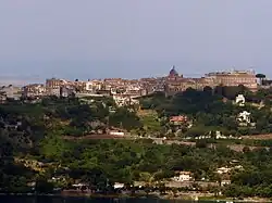 All of these properties were in one way or another acquired by the state, and under Octavian Augustus they constituted a single imperial estate known as Albanum Caesari.[4] The last Flavian emperor, Domitian, wanted to build himself a sumptuous villa in the center of this estate, in a panoramic position overlooking both the lake and the coastal plain below.[5] The villa was frequented until the Hadrianic period, and then decayed. Septimius Severus built on the edge of the property the encampment of his veterans of the Legio II Parthica, the Castra Albana, of which abundant ruins remain in the historic center of Albano Laziale.[6]