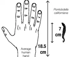 | Graphic comparing the maximum length of Pontobdella californiana with an average human hand. | |