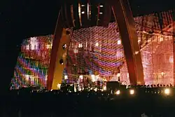 After producing the band's previous tour, Zoo TV, which featured a complex setup involving 36 different video screens,[11] Williams did not want to produce another video-based show unless it was going to be completely different from its predecessor. His initial proposals to U2 featured physical designs, including a center stage surrounded by a racetrack with circling trucks and motorbikes.[3] Fisher researched one of the first LED screens to be imported into the United States. (It was built for the State Fair of Texas in 1995). Fisher proposed to make a much larger LED screen by spacing the pixels further apart, thus creating a lower resolution image. A prototype was built with LED pixels placed 75 mm (3 in) apart on a cargo net. It worked successfully and served as a basis for the proposal of the design.[12] The idea for producing another video-based tour gained much interest when Fisher and Williams were determined to create the largest video screen in existence at that time. When the idea for the screen was proposed to U2, they decided to take the risk of creating a show based on an undeveloped technological experiment, and invested US$7 million to develop the screen.[13]