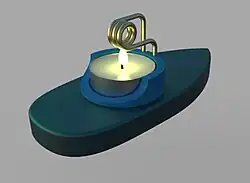 A pop pop boat is powered by a simple heat engine. This engine, sometimes referred to as a pulsating water engine,[1] consists of a boiler and one or more exhaust tubes. A heating element of some sort is placed under the boiler. Candles or small oil burners are commonly used. While a single exhaust tube may be used, two exhaust tubes are much more commonly used. This is because the boiler and the exhaust tubes have to be filled with water, and using two tubes allows water to be injected into one tube while air inside the engine escapes through the other tube. The boiler and exhaust tubes are usually made out of metal, with tin or copper being common.