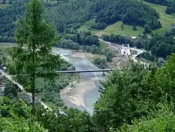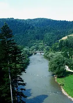 The Poprad forms several dramatic meanders between the towns of Piwniczna and Muszyna. The river also forms picturesque gorges in its upper and middle run, of which the most prominent is the one between Piwniczna and Rytro,[1] usually referred to as the Gorge, dividing Beskid Sądecki into two separate mountain chains called Pasmo Radziejowej and Pasmo Jaworzyny.[2]