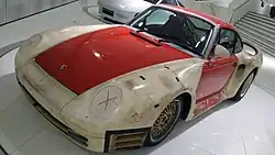 In 1986, the racing variant of the 959, the Porsche 961, made its debut at the 24 Hours of Le Mans. Driven by René Metge partnering Claude Ballot-Léna, it finished first in its class and 7th overall. It also participated in the IMSA championship in the United States but suffered tyre issues with Daytona Speedway's banking.[30] The 961 returned to Le Mans in 1987 but while in 11th place Canadian/Dutch driver Kees Nierop mis-shifted from 6th into 2nd gear and crashed into the guard-rail. Upon re-joining the track, the car was observed on TV monitors in the Porsche pits to be on fire and the driver was told to stop and get out of the car. Nierop pulled over between marshal stations and this extra time taken to get to the car by the marshals allowed the fire to consume most of the rear end and destroy the car. It was later repaired and put on display at the Porsche Museum.[31]
