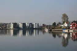 Porsgrunn has been an important harbor town in the Grenland area since the late 16th century. In 1653, the Customs House was moved further down the Skien river from Skien to Porsgrunn mainly because industrial waste such as sawdust and mud made the river too shallow to allow boats to go any further up the river.[11] Moving the Custom House to Porsgrunn added to the flourishing harbor activity and Porsgrunn became a thriving market town with a ladested status.[12][13][14]