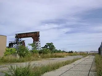 Port Morris Ferry Bridges, also known as the 134th Street Ferry Bridges, are two historic bridges in the Port Morris neighborhood of the Bronx in New York City. They were built in 1948 by the New York, New Haven and Hartford Railroad, and are constructed of steel and copper in industrial-style truss construction. Each bridge stands four to five stories tall and covered in corrugated steel metal. They feature wire rope pulley systems, wooden gangways, and pontoons. They were constructed to hoist the bases of ferry boats in and out of the river as they came into dock.[2]: 3, 7
