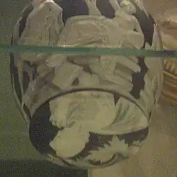 Cameo glass vessels were probably all made within about two generations,[9] as experiments when the blowing technique (discovered in about 50 BC) was still in its infancy. Recent research suggests that the Portland Vase, like most cameo glass vessels, was made by the dip-overlay method, whereby an elongated bubble of glass was partially dipped into a crucible of white glass before the two were blown together. After cooling the white layer was cut away to form the design.[10]