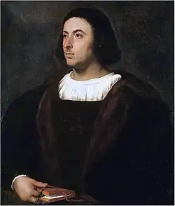 Both the names formerly given to this picture, Boccaccio and Alessandro de' Medici, are incorrect.[2] The sitter is now thought to be Jacopo Sannazaro, a poet and humanist from Naples. This identification was first proposed by Georg Gronau in 1895, and is supported by an early copy of the painting (Walker Art Gallery, Liverpool) inscribed Sincerus Sannzarius ("Actius Sincerus" was a known alias of Sannazaro).[1]