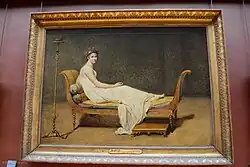 It was at the age of 23 that she began to model for various artists of the early 19th century in France, including David. Her likeness was captured in David's Neoclassical portrait, yet was abandoned, much to the subject's dismay. Originally, he intended to capture not only her appearance, but also the ideals of femininity and charm.[1] David began the painting in May 1800 but may have left it unfinished when he learned that Récamier, having grown impatient with David, commissioned his student François Gérard to paint her portrait (Gerard's portrait was completed in 1805). David's painting was acquired by the Louvre in 1826, over twenty years after it was begun. Yet it was warmly welcomed, and according to Scottish painter and art critic, D.S. MacColl, "from 1826 his unfinished Madame Recamier has spoken for something better in the Louvre, and since then a whole series of portraits have accrued which will prove his lasting security when 'Horatii,’ 'Sabines,’ and the rest have gone the dusty way to respectable oblivion".[3]