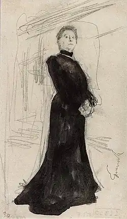 The Tretyakov Gallery holds the only known preparatory sketch for Portrait of Maria Yermolova, executed in graphite pencil and watercolour on paper.[Notes 4] This early study reveals Serov’s initial focus on emphasising the actress’s silhouette—dark against a light background, with clearly defined contours. At this stage, however, the facial expression of Maria Yermolova had not yet been developed.[8] The composition was already determined, including the viewpoint from below, which Serov later adjusted in the final painting. The head is eventually shown in a more pronounced three-quarter view, and the shoulders are rendered with greater refinement.[36] The sketch also shows that the artist originally conceived the figure as more compact; the later elongation, which lends the final portrait its monumental character, was a subsequent decision.[8][37]