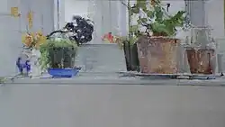 D. G. Seryakov evaluated the painting as a work in the Art Nouveau style.[36] He noted that the plane of the light gray wall emphasizes the conventionality of the visual space. The color of the portrait is restrained, based on combinations of different shades of white and gray, but the bright and juicy pots of flowers, dishes on the table, and fruit are vividly painted. The contrast with the wall background is further emphasized by the girl's dark hair, black shoes, and the metal kettle on the table. Seryakov highlights the artist's use of dark fragments made with strokes of ultramarine, where Fechin achieves an original optical effect (blending – at a distance, ultramarine merges with nearby colors into a single tone, but up close, it creates sharp contrasts). Fechin used this effect in depicting the girl's hair and brown eyes. Seryakov believes that in this painting, Fechin turns to the effect of intentional incompleteness (non-finito), but here this effect has a “more restrained sound” than in his other paintings, and “gravitates toward the natural conventionality of the pictorial manner”.[37]