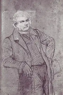 Louis-François Bertin was aged 66 when portrayed in 1832.[1] He had befriended Ingres either through his son Édouard Bertin, a student of the painter,[2] or via Étienne-Jean Delécluze, Ingres' friend and the Journal's art critic.[3] In either case the genesis of the commission is unknown. Bertin was a leader of the French upper class and a supporter of Louis Philippe and the Bourbon Restoration. He was a director of the Le Moniteur Universel until 1823 when the Journal des débats became the recognised voice of the liberal-constitutional opposition after he had come to criticize absolutism. He eventually gave his support to the July Monarchy. The Journal supported contemporary art, and Bertin was a patron, collector and cultivator of writers, painters and other artists.[4] Ingres was sufficiently intrigued by Bertin's personality to accept the commission.[2]