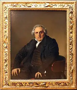 Portrait of Monsieur Bertin is an 1832 oil on canvas painting by Jean-Auguste-Dominique Ingres. It depicts Louis-François Bertin (1766–1841), the French writer, art collector and director of the pro-royalist Journal des débats. Ingres completed the portrait during his first period of success; having achieved acclaim as a history painter, he accepted portrait commissions with reluctance, regarding them as a distraction from more important work. Bertin was Ingres' friend and a politically active member of the French upper-middle class. Ingres presents him as a personification of the commercially minded leaders of the liberal reign of Louis Philippe I. He is physically imposing and self-assured, but his real-life personality shines through – warm, wry and engaging to those who had earned his trust.