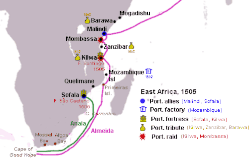 Early September 1505 - After gathering his scattered ships, Pêro de Anaia requests an audience with the sheikh Isuf of Sofala. As noted earlier, sheikh Isuf had agreed to a commercial treaty back in 1502, but the city itself belongs to the Monomatapa. What Pêro de Anaia was now proposing - the establishment of a permanent Portuguese factory and fort in the city – probably exceeds Isuf's authority to allow. Nonetheless, the recent news of Almeida's attacks on Kilwa and Mombasa persuade sheikh Isuf that a similar fate might await Sofala if he shows any sign of legal quibbling or recalcitrance. So a new deal is struck and Isuf 'allows' the Portuguese to establish a factory and a fort. As a sign of goodwill, Isuf hands over to Anaia another twenty Portuguese survivors of the Lopo Sanchez caravel that had he had collected.[10]