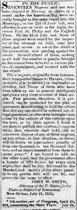- ^ a b Sparks, Randy J. (2017). "Blind Justice: The United States's Failure to Curb the Illegal Slave Trade". Law and History Review. 35 (1): 53–79. doi:10.1017/S0738248016000535. JSTOR 26338410.