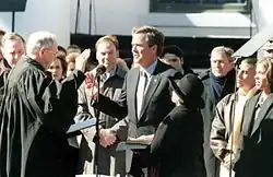 On April 25, 2014, Frederick D. McClure, chief executive of the Bush library foundation, organized a three-day gathering in College Park, Texas, to mark the 25th anniversary of the Bush administration. Also in early 2014, the John F. Kennedy Library Foundation presented the Profile in Courage Award to Bush and Mount Vernon awarded him its first Cyrus A. Ansary Prize.[65] The Kennedy foundation award was presented by Jack Schlossberg, the late president's grandson, to Lauren Bush Lauren, who accepted on her grandfather's behalf.[66] The Ansary prize was presented in Houston with Ansary, Barbara Lucas, Ryan C. Crocker, dean of the Bush school since January 2010, Barbara Bush, and Curt Viebranz in attendance with the former president. Bush directed $50,000 of the prize to the Bush School of Government and Public Service at Texas A&M University, and $25,000 to fund an animation about the Siege of Yorktown for Mount Vernon.[67] Viebranz and Lucas represented Mount Vernon at the presentation.[68][69]