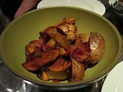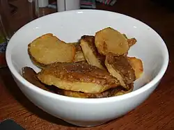 | Home fries | | United States United Kingdom | A type of basic potato dish made by pan- or skillet-frying chunked, sliced, wedged or diced potatoes that are sometimes unpeeled and may have been par-cooked by boiling, baking, steaming, or microwaving. |