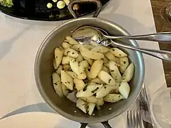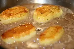 | Fondant potatoes | France | Cylinders of potato part-cooked by frying, then finished in a simmering mixture of butter and stock. | |