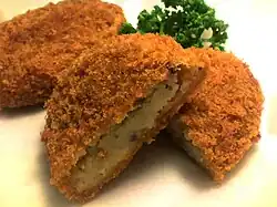| Korokke | | Japan | Is a Japanese deep-fried dish originally related to a French dish, the croquette. Korokke is made by mixing cooked chopped meat, seafood, or vegetables with mashed potato or white sauce, usually shaped like a flat patty, rolling it in wheat flour, eggs, and Japanese-style breadcrumbs, then deep-frying this until brown on the outside. |