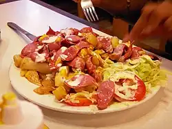 | Olivier salad | Russia | A salad with many variations. Also known as Russian salad or Stolichny salad. It usually includes potatoes, diced boiled chicken (or sometimes ham or bologna sausage), eggs, brined dill pickles, carrots, green peas and onions, dressed with mayonnaise. Variations of this salad are also popular in Eastern Europe, the Balkans, Spain, as well as in some Asian and South American countries. | |
