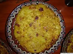 | Kugelis | | Lithuania | Potatoes, bacon, milk, onions, and eggs, baked in a low casserole dish. |