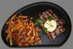| Steak frites | | France and Belgium | Pan-fried steak paired with deep-fried potatoes (French fries). |