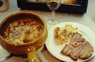 | Baeckeoffe | | Alsace, France | A mix of sliced potatoes, sliced onions, cubed mutton, beef and pork which have been marinated overnight in Alsatian white wine and juniper berries and slow cooked in a sealed ceramic casserole dish. |