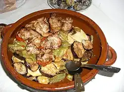 | Tombet | | Spain | Sliced potatoes, eggplant, and red bell peppers previously fried in olive oil, served in a low-sided dish. |