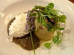 | Gratin | | France, Switzerland | A widespread culinary technique in food preparation in which an ingredient, often potato, is topped with a browned crust, often using breadcrumbs, grated cheese, egg or butter.[28][29][30] Gratin is usually prepared in a shallow dish of some kind. It is baked or cooked under an overhead grill or broiler to form a golden crust on top and is traditionally served in its baking dish.[28] |