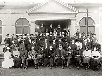 ![]() Pupils and staff of the preparatory school (later Potchefstroom Gimnasium) in front of the school | |