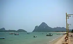 Prachuap Bay lies north of Ao Manao and south of Ao Noi. It is open towards the east and is bound by steep limestone outcrops forming peninsulas to the north, at Khao Ta Mong Lai and to the south at Khao Lom Muak.[2] There are four islands in the bay area, Ko Lak, Ko La, and Ko Rom towards the southern end of the mouth of the bay, and larger Ko Raet further off-shore.[3]