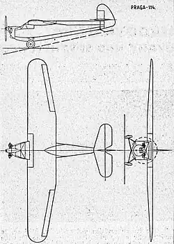 The Praga E.114, first flown in 1934 and designed by Jaroslav Šlechta, was a high wing, cantilever monoplane seating two in a side-by-side cabin. It was an all wood aircraft with a two spar single piece wing; the spars and ribs were built from pine and plywood and the wing plywood covered. The wing section was reflexed at the trailing edge. The wing had a constant chord centre section with taper on the trailing edge outboard and rounded tips. The ailerons were plywood covered and unbalanced.[1][2]