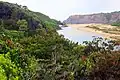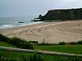 The main beach of Praia de Odeceixe is situated at the mouth of the Rio de Seixe (River Seixe), right on the border between the Algarve and the Alentejo. This sandy beach is on the southern side of the outflow to the sea. The northern side of the river has a backdrop of steep cliffs which shelter the beach.[4] To the south of the main beach is a small cove with a sandy satellite beach called Praia de Adegas which has been designated a naturist beach.[5] Also to the south of the main beach is the small village of Praia de Odeceixe, from where a steep path descends to the beach.