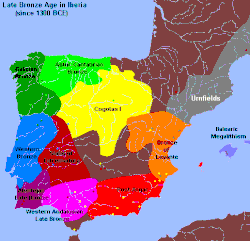 The transformation from Tartessian to Iberian culture was not sudden but gradual and was more marked in the East, where it begins in the 6th century BC, than in the south-west, where it is only noticeable since the 5th century BC and much more tenuous. A special case is the northeast where the Urnfield culture was Iberized but keeping some elements from the Indo-European substrate.[8]