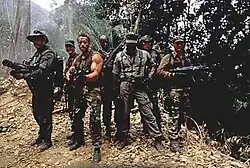 According to Schwarzenegger, filming was physically demanding. The actor—and former bodybuilder—shipped gym equipment to Mexico and trained intensively every day before shooting began, usually with his co-stars.[13] Screenwriter Jim Thomas was impressed with the training regimen and said: "I think that phrase 'manly men' was coined [during the production of Predator]".[13] Among other tasks, Schwarzenegger had to swim in very cold water and spent three weeks covered in mud for the climactic battle with the alien.[14] In addition, cast and crew endured very cold temperatures in the Mexican jungle that required heat lamps to be on all of the time. Cast and crew filmed on rough terrain that, according to the actor, was never flat, "always on a hill. We stood all day long on a hill, one leg down, one leg up. It was terrible."[14] Schwarzenegger also faced the challenge of working with Kevin Peter Hall, who could not see in the Predator suit. The actor recalled that "when he's supposed to slap me around and stay far from my face, all of a sudden, whap! There is this hand with claws on it!"[14] Hall stated in an interview that his experience on the film "wasn't a movie, it was a survival story for all of us."[15] For example, in the scene where the Predator chases Dutch, the water was foul, stagnant and full of leeches.[15] Hall could not see out of the mask and had to rehearse his scenes with it off and memorize where everything was. The outfit was difficult to wear because it was heavy and affected his balance.[15]