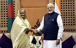 During the 2023 G20 New Delhi summit, Hasina had a bilateral meeting with Indian Prime Minister Narendra Modi to discuss diversifying India-Bangladesh cooperation, including areas like connectivity and commercial linkages.[61] She was accompanied by her daughter Saima Wazed, who is a candidate for a WHO election.[62] The summit also provided an opportunity for Hasina to meet other global leaders and strengthen Bangladesh's bilateral ties.[63]
