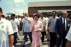 Aquino and other top officials fired pro-Marcos governors and mayors, replacing them in all provinces with people loyal to Aquino.[6] Aquino's new government was met with criticism from Defense Minister Juan Ponce Enrile and Vice President Salvador Laurel; constitutionalist and retired Supreme Court Justice Cecilia Muñoz-Palma also vehemently opposed the move. "To declare her government “revolutionary" and abolish the Batasan Pambansa was to behave no better than Dictator Marcos", Palma said.[7] Homobono Adaza, who brokered the opposition coalition, "when the United Democratic Opposition (UNIDO) decided to support Cory for President, the agreement with Cory was that the type of government of Marcos would be continued, with Cory as ceremonial President, since everyone knew that Cory had no knowledge of how to run the country, and Cory admitted this."[8] Enrile and Laurel subsequently resigned from Aquino's government.