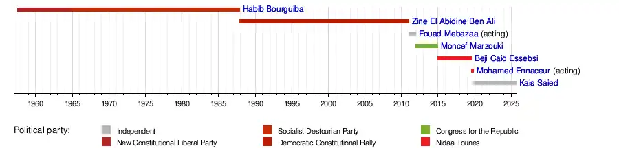 | 7[b] | | Kais Saied (b. 1958) | 23 October 2019 – Incumbent | Independent | 2019 | Saied won the first presidential election in which a presidential debate was held. | |