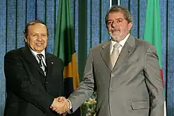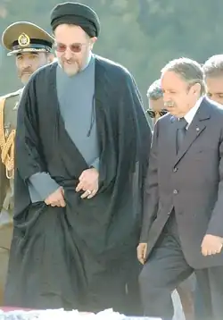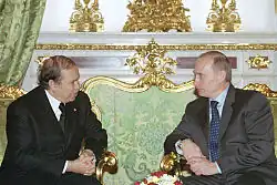 Bouteflika presided over the Organisation of African Unity in 2000, secured the Algiers Peace Treaty between Eritrea and Ethiopia, and supported peace efforts in the African Great Lakes region.[29] He also secured a friendship treaty with nearby Spain in 2002, and welcomed president Jacques Chirac of France on a state visit to Algiers in 2003.[30][31] This was intended as a prelude to the signature of a friendship treaty.[31]