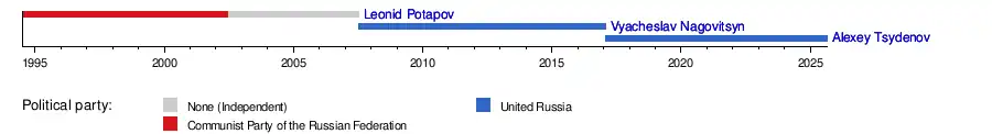 | 1 | | Leonid Potapov (1935–2020) | 1 July 1994 | 10 July 2007 | 13 years, 9 days | Communist Party of the Russian Federation | 1994 1998 | ||