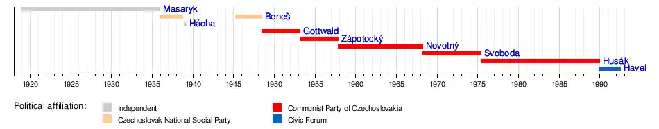 | 6 | | Antonín Novotný (1904–1975) | Czech | 1957 1964 | 19 November 1957 | 22 March 1968 | 10 years, 124 days | Communist Party of Czechoslovakia | ||