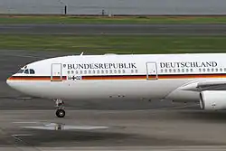 The president's car is usually black, made in Germany and has the numberplate "0 – 1" with the presidential standard on the right wing of the car. The president also uses a VIP helicopter operated by the Federal Police and VIP aircraft (Bombardier Global 5000, Airbus A319CJ, Airbus A310, or A340) operated by the Executive Transport Wing of the German Air Force. When the president is on board, the flight's callsign is "German Airforce 001".
